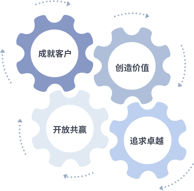 成就客户是一切决策的出发点,,,创造价值是衡量所有工作的标准,,追求卓越是我们做事做人的态度,,开放共赢是我们的格局也是最终的结果。。。价值观的齿轮环环相扣,,推动着组织里的每个人不断向前。。